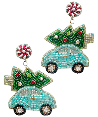 GS - Blue Car with Christmas Tree Beaded Earrings