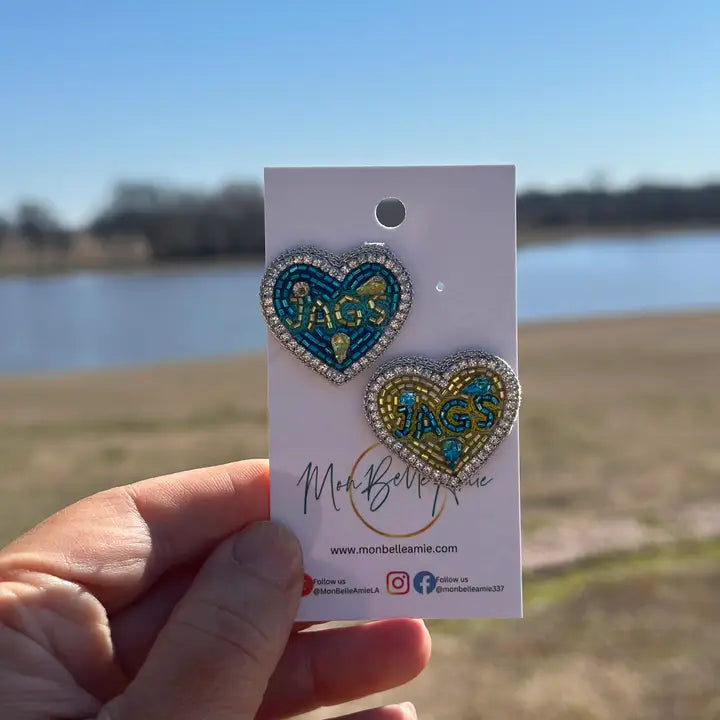 Show your Southern University pride in style with these Jags Heart-Shaped Beaded Jeweled Stud Earrings! Designed in the school’s signature Carolina blue and yellow, each earring features intricate hand-beading and shimmering silver rhinestones for the perfect touch of sparkle. One earring is bold yellow, while the other is vibrant blue, both featuring the word “Jags” for a standout game-day look. Made for comfort and durability, they have a soft suede backing and hypoallergenic 18K gold-plated posts, making them perfect for all-day wear. Whether you’re cheering from the stands or showing school spirit year-round, these earrings are a must-have for any Southern University fan!