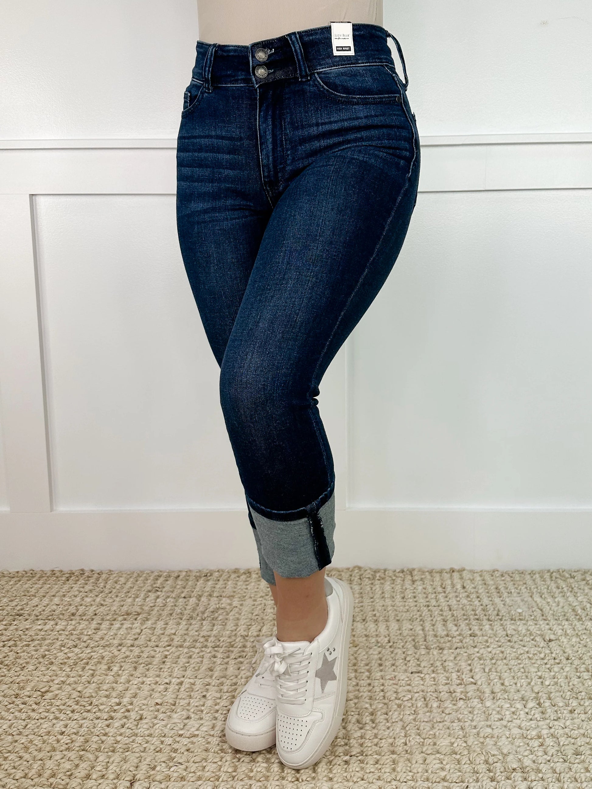 Get ready to rock the double button trend with Judy Blue's June High Rise Capris! These classic dark wash capris are super stretchy for ultimate comfort and can be worn cuffed or uncuffed for a versatile look. Perfect for any occasion, these capris will keep you looking stylish and feeling confident.